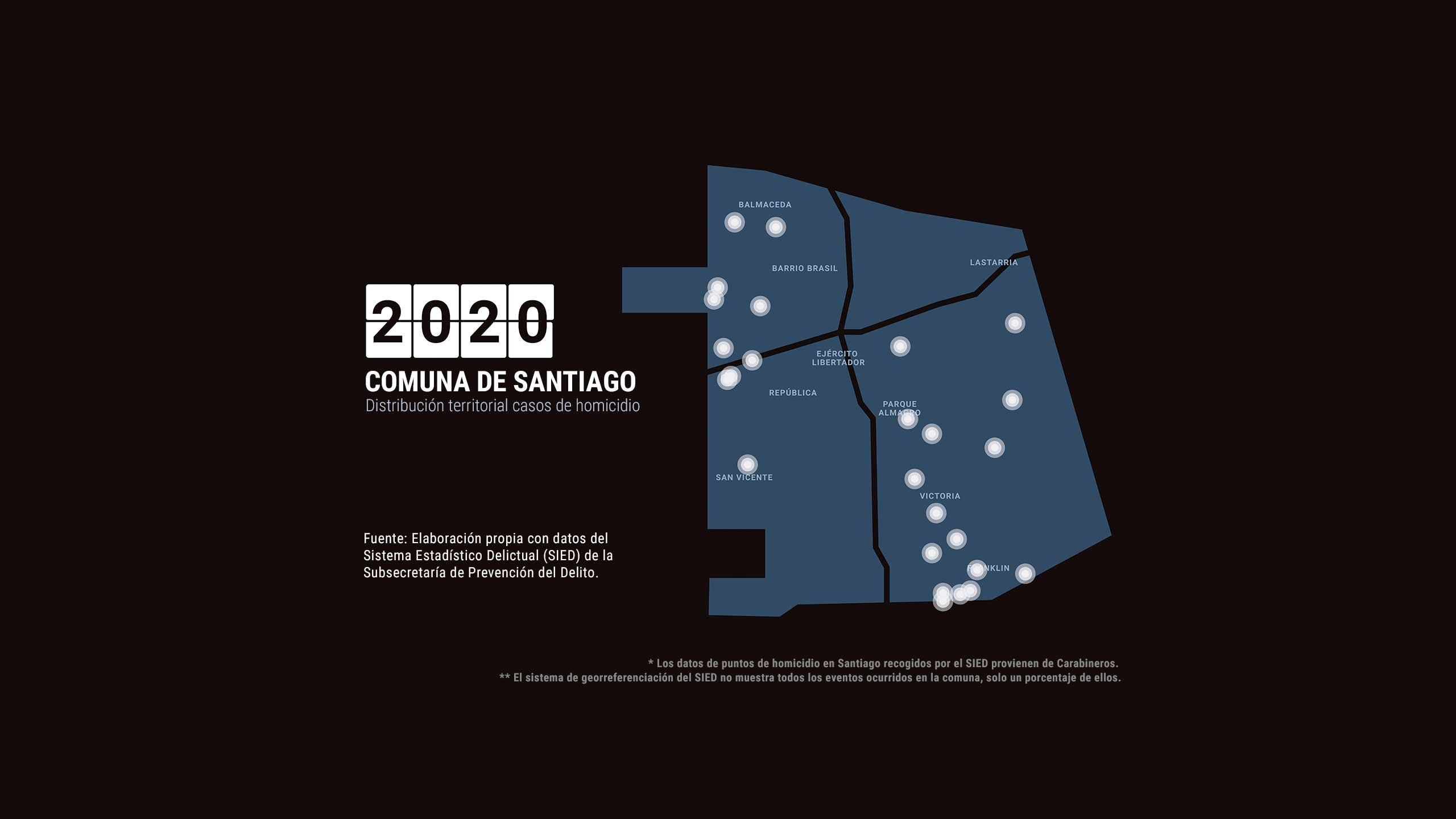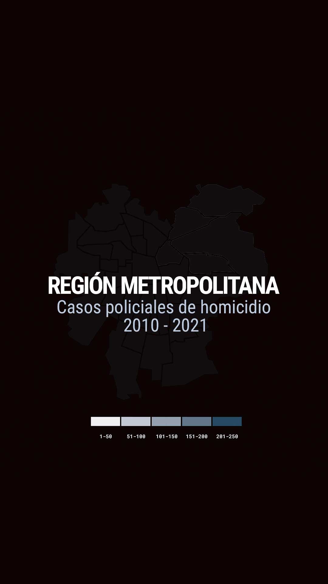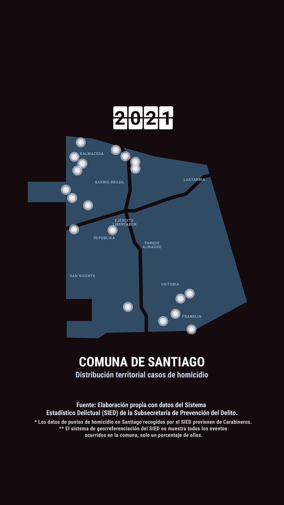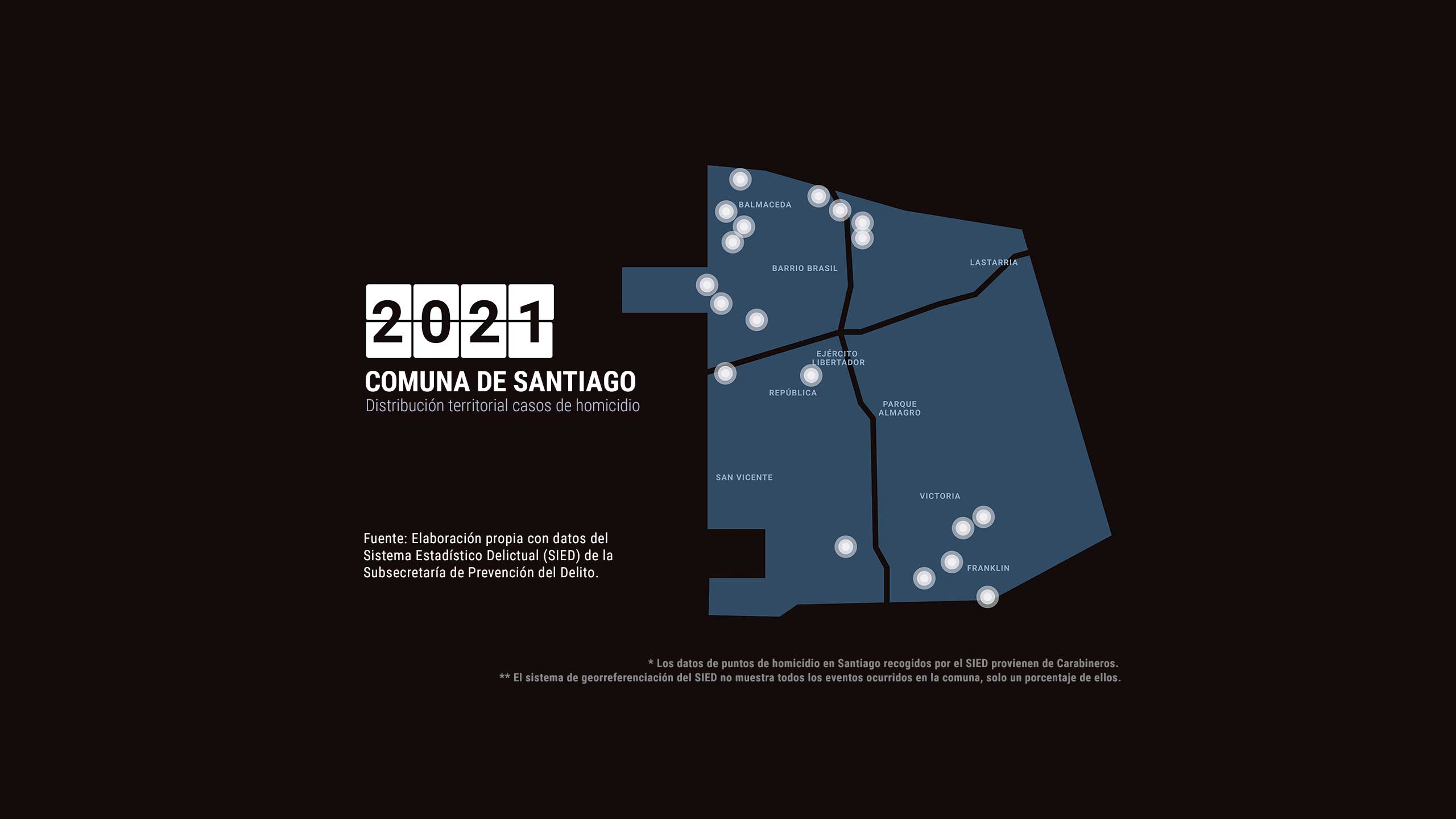 En la Región Metropolitana, Santiago es una de las comunas con mayor crecimiento de este tipo de eventos en los últimos años. Allí, la SPD registra 191 casos policiales de homicidio entre 2010 y 2021. El peak fue en 2020 con 33 casos, un aumento en casi 6 veces respecto de 2010.