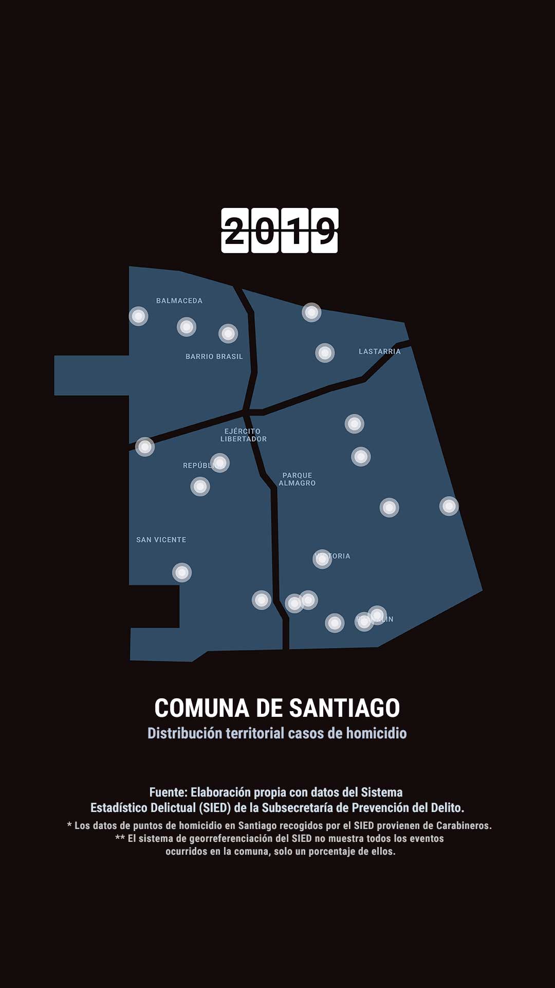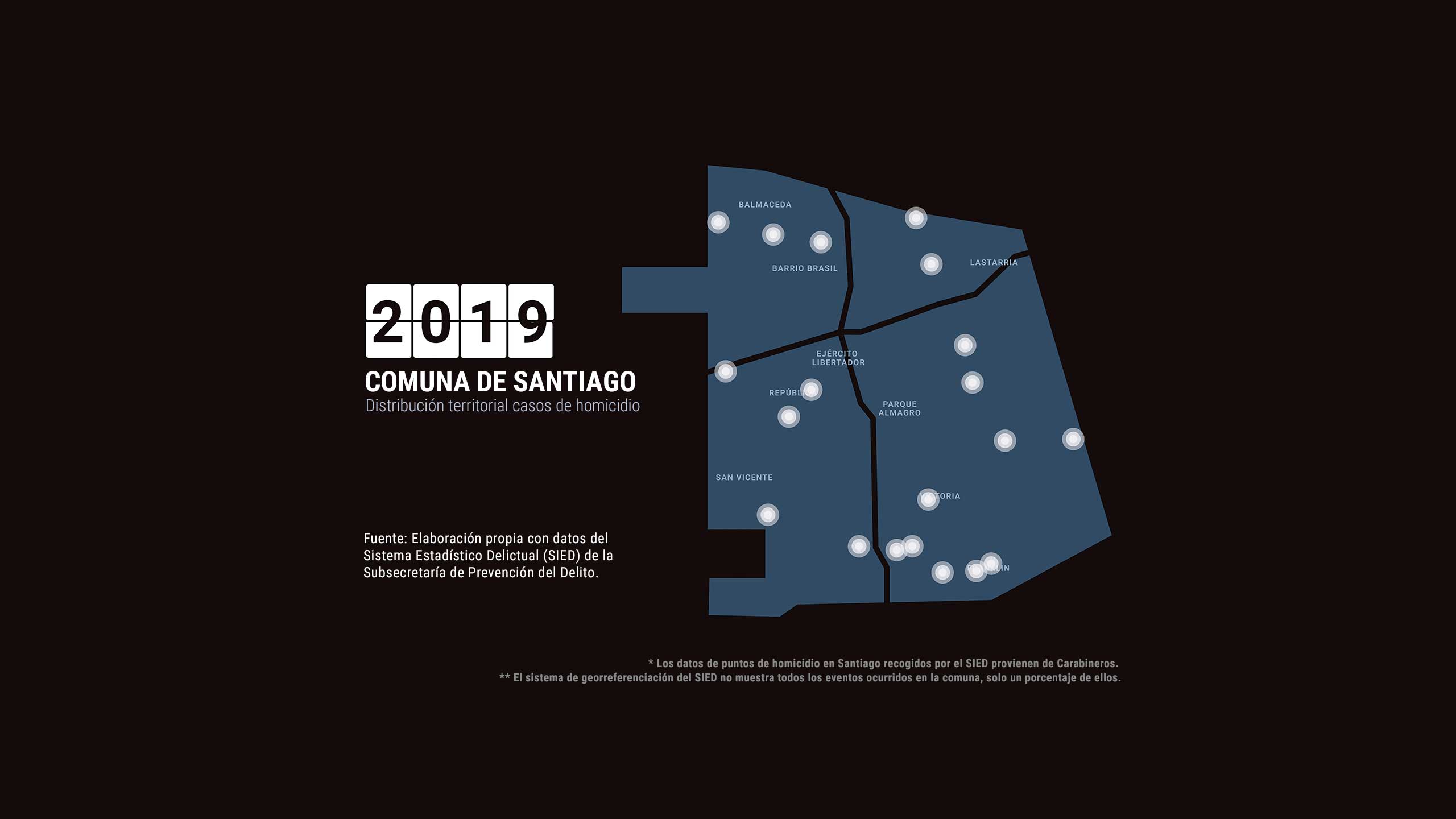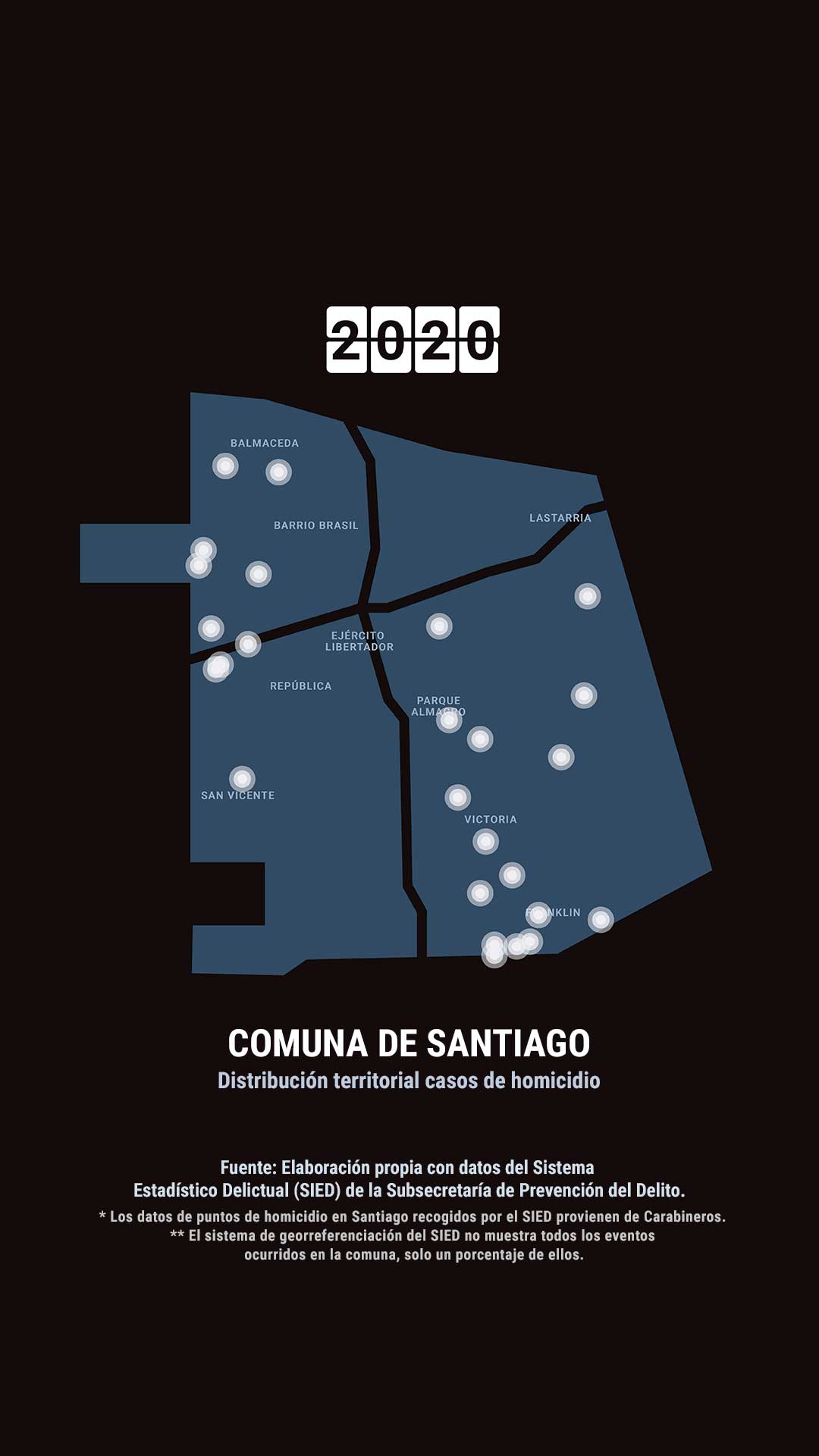 En la Región Metropolitana, Santiago es una de las comunas con mayor crecimiento de este tipo de eventos en los últimos años. Allí, la SPD registra 191 casos policiales de homicidio entre 2010 y 2021. El peak fue en 2020 con 33 casos, un aumento en casi 6 veces respecto de 2010.