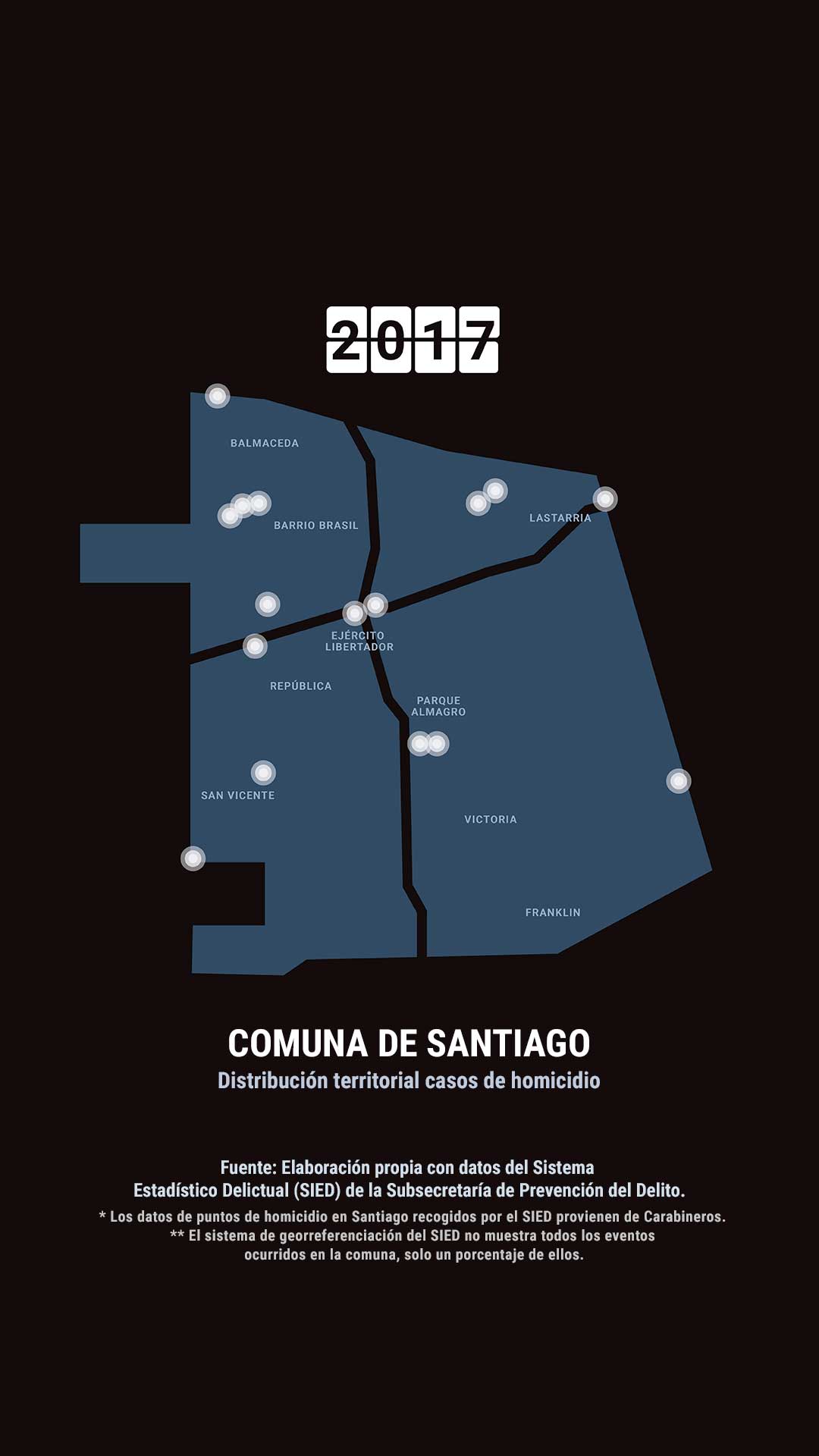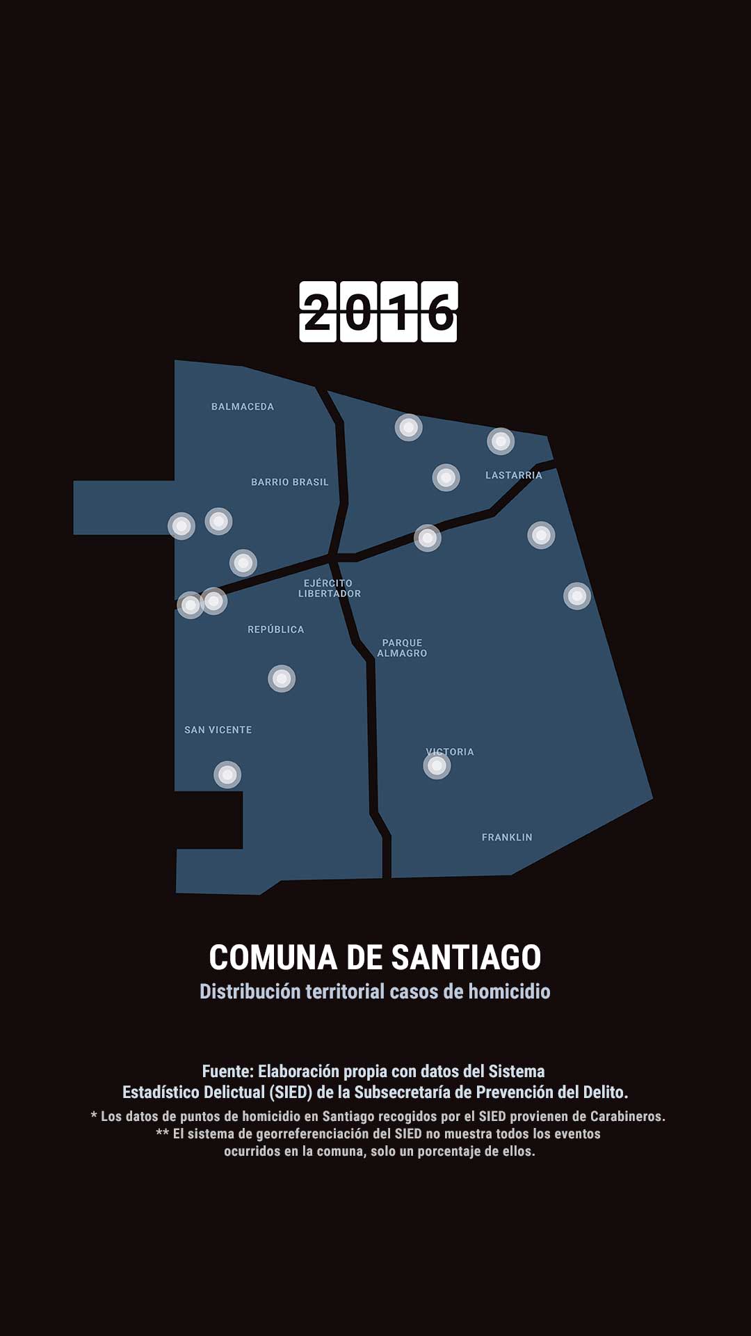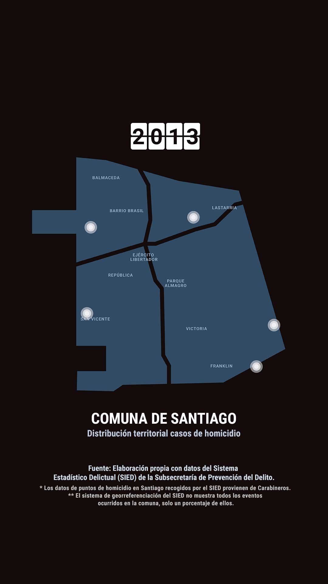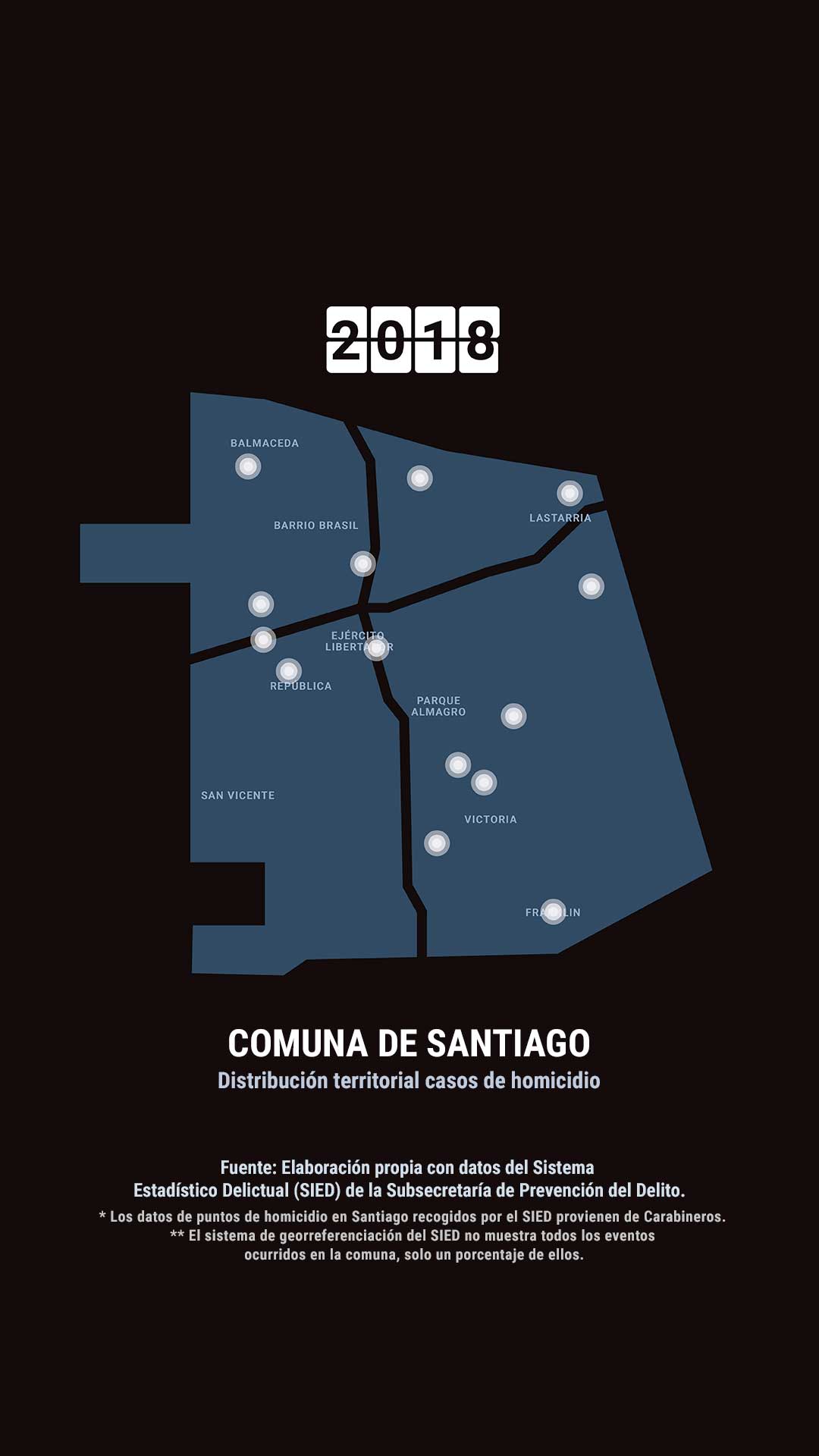En la Región Metropolitana, Santiago es una de las comunas con mayor crecimiento de este tipo de eventos en los últimos años. Allí, la SPD registra 191 casos policiales de homicidio entre 2010 y 2021. El peak fue en 2020 con 33 casos, un aumento en casi 6 veces respecto de 2010.
